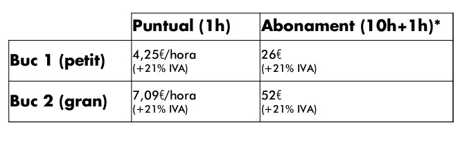 * Els abonaments inclouen 10h d’assaig. Cada abonament, inclou 1 hora d’assaig gratuïta.
